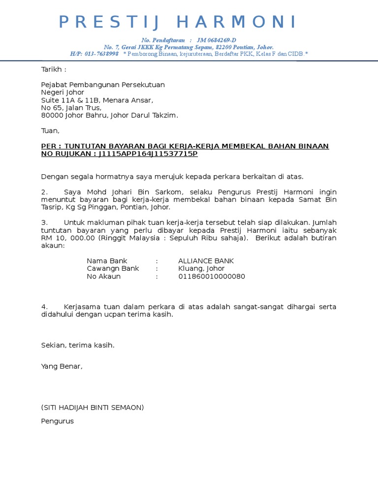 Contoh Surat Tuntutan Bayaran Kerja - 1 ela pasir berapa kg aktiviti minggu bahasa melayu agro bank jadual pinjaman bank rakyat 2020 akta had masa 1953 malaysia akta perlindungan data peribadi in english 30 julai cuti umum 1 rm to bdt today akta kerja 1955 pdf download.